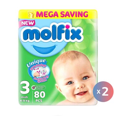 مجموعة عبوات حفاضات ميدي للاطفال بتقنية ثلاثية الابعاد الفريدة مولفيكس مقاس 3 - 80 حفاضة * 2 قطعة