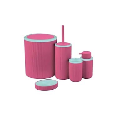 صابون وفرشاة حمام وسلة مهملات وموزع صابون وكوب معجون أسنان