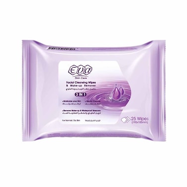 مناديل مبللة ايفا 3في1 مزيلة للمكياج ومنظفة للوجه، للبشرة العادية والجافة - 25 منديل