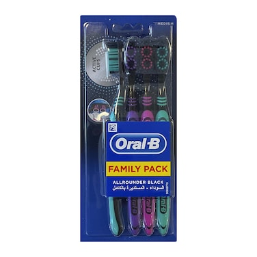 أورال بي فاميلي باك فرشاة أسنان سوداء مستديرة بالكامل - مقاس ميديوم - 4 فرشاة