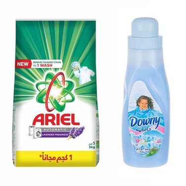 اريال مسحوق غسيل اوتوماتيك برائحة اللافندر - 5 كجم + داوني نسيم الوادي منعّم الأقمشة المركز - 1 لتر