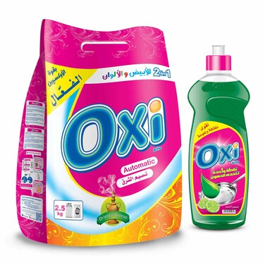 أوكسي مسحوق غسيل أوتوماتيك - 2.5 كيلو جرام - رائحة نسيم الشرق + أوكسي مسحوق سائل أطباق - رائحة ليمون أخضر - 600 مللي