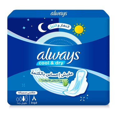 أولويز فوط صحية كول أند دراي - طويلة جدًا - انتعاش الألوفيرا - 8 فوط