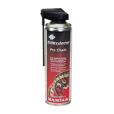 Fully synthetic racing chain lubricant, A clear, clean, thin film, synthetic chain lubricant designed for maximum fling off resistance when used for racing. Silkolene Pro Chain incorporates a micronized laminar solid lubricant which combined with advanced synthetics gives outstanding boundary lubrication leading to lower friction and reduced wear.