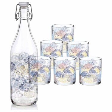 Set Indro Lella 7 Pieces from Decover that contains of 1 bottle and 6 glass cups. Ideal for serving all beverages and juices, given the bottle's capacity of 1 Liter and the cups capacity of 250 ml.