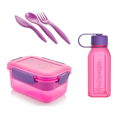 M-Design Lunch Set - 1.1L Lunch Box with 500ml Water Bottle and 3-Piece Cutlery Set - Pink/Purple